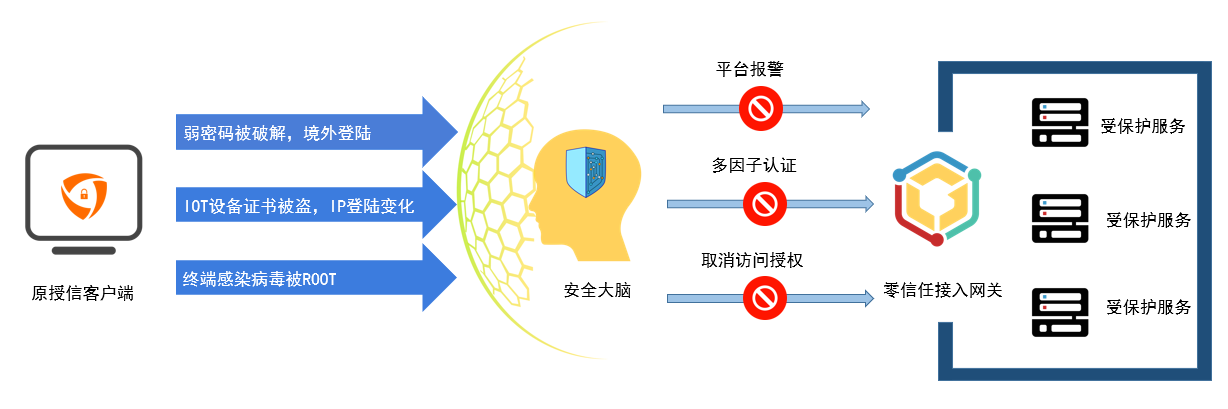 云涌零信任可以保護邊緣計算設(shè)備的身份安全與數(shù)據(jù)安全,使每個邊緣網(wǎng)關(guān)成為獨立的安全區(qū)段, 網(wǎng)關(guān)內(nèi)業(yè)務(wù)服務(wù)受零信任平臺保護。