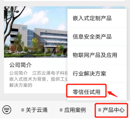 首先關(guān)注云涌科技官方微信公眾號,然后進(jìn)入【產(chǎn)品中心】菜單,并點(diǎn)擊下拉菜單中的【零信任試用】進(jìn)入試用頁面,點(diǎn)擊免費(fèi)試用根據(jù)提示操作即可。