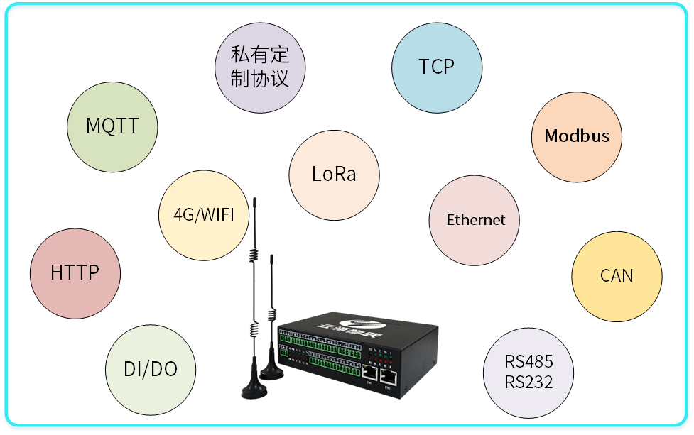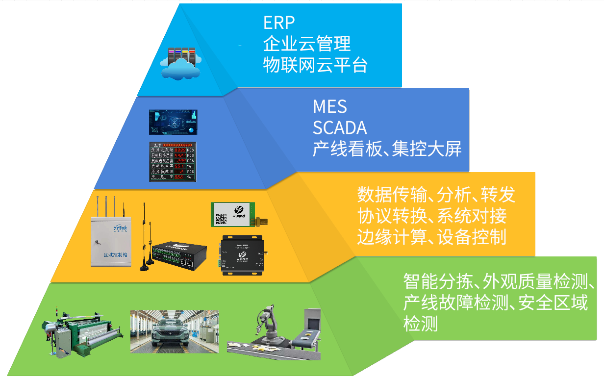 在工廠內(nèi)的各個(gè)終端節(jié)點(diǎn)(傳感器、工業(yè)設(shè)備、工業(yè)相機(jī))使用LORA DTU和LORA模組升級(jí)設(shè)備和傳感器,使設(shè)備具備無線傳輸能力,實(shí)現(xiàn)對(duì)生產(chǎn)數(shù)據(jù)的實(shí)時(shí)上報(bào)和操作指令接收。通過云涌智能無線網(wǎng)關(guān)對(duì)著這些終端節(jié)點(diǎn)進(jìn)行數(shù)據(jù)的采集和接收,再由網(wǎng)關(guān)進(jìn)行數(shù)據(jù)分析和協(xié)議轉(zhuǎn)換,與上層的不同業(yè)務(wù)系統(tǒng)進(jìn)行數(shù)據(jù)的交互。