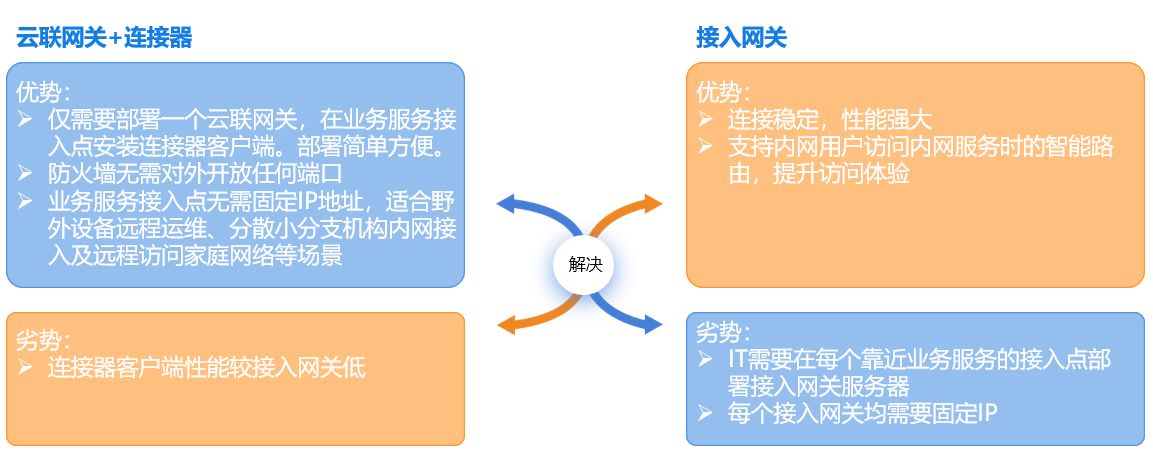 云涌遠程辦公解決方案支持兩種內網訪問模式:基于接入網關的訪問代理,以及基于云聯網關+連接器的內網穿透??蛻艨梢愿鶕陨鞩T架構及實際需求選擇適合的服務訪問模式。兩種模式可以同時存在。