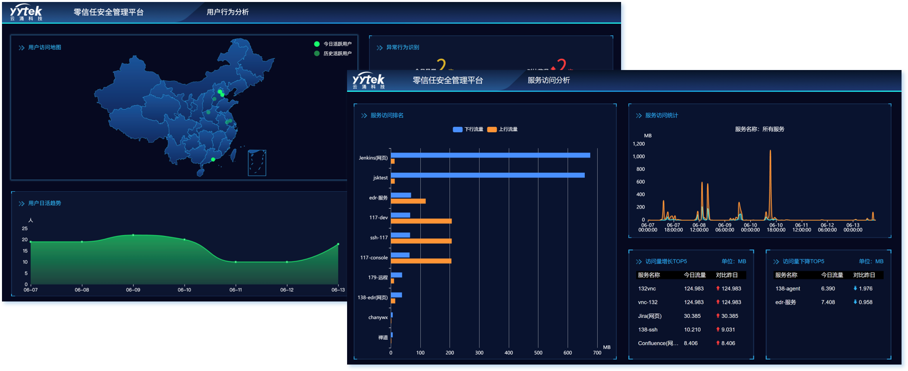 方案提供了用戶使用行為的態(tài)勢分析以及服務訪問態(tài)勢分析,通過態(tài)勢大屏展示方便日常管理及領導審閱。