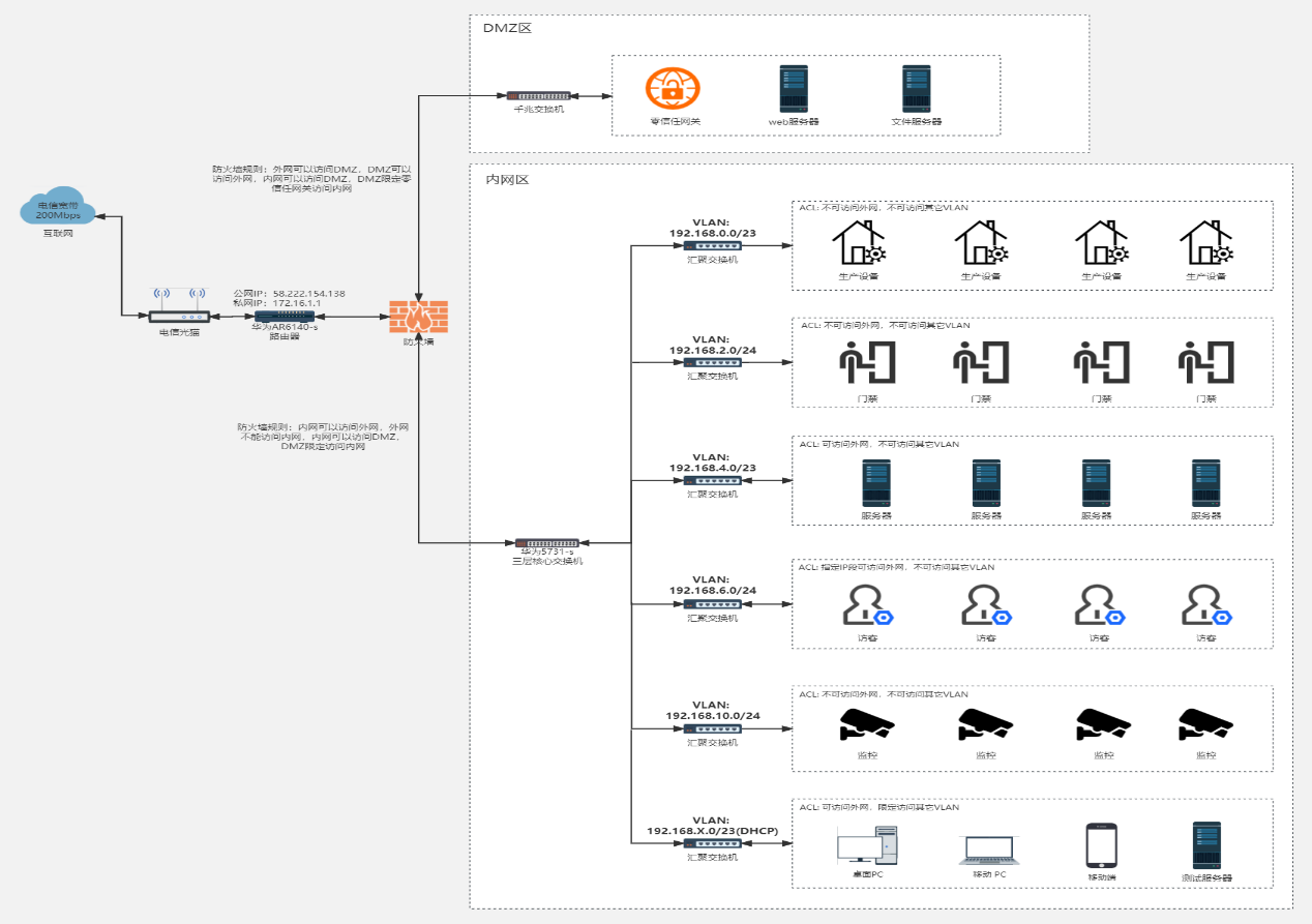 ? ? ? 其次,為了解決內(nèi)網(wǎng)安全隱患,根據(jù)業(yè)務(wù)類型和部門劃分不同的VLAN,各VLAN之間的通過(guò)ACL策略進(jìn)行合理的訪問(wèn)控制。同時(shí)建立DMZ區(qū),DMZ區(qū)用來(lái)放置必須公開的服務(wù)器資源(如企業(yè)Web服務(wù)器、文件服務(wù)器、論壇等)和零信任網(wǎng)關(guān),外網(wǎng)、DMZ和內(nèi)網(wǎng)之間通過(guò)防火墻進(jìn)行隔離。