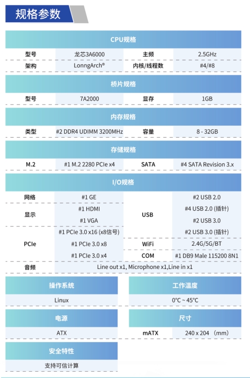 由云涌科技推出的基于3A6000的系列產(chǎn)品,采用4核處理器構建,主頻2.5GHzo,搭配7A2000橋片,1GB獨立顯存,支持2路UDIMM3200DDR4內(nèi)存條,支持M.2接口,可作為小容量固態(tài)系統(tǒng)盤使用,應用于家用娛樂、商務辦公等場景。