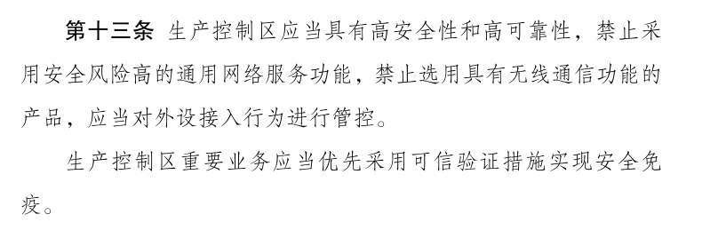 ? ? ? 第十三條明確提到:生產控制要業(yè)務應當優(yōu)先采用可信驗證措施實現(xiàn)安全免疫,第十六條明確提到:電力監(jiān)控系統(tǒng)優(yōu)先選用安全可信的產品和服務,電力監(jiān)控系統(tǒng)投運前應當進行安全加固,包括主機加固、系統(tǒng)加固等。