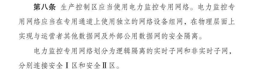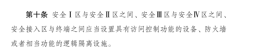 ? ? ? ? 其中第八條和第十條首次提出了邏輯隔離的概念,提到生產控制區(qū)應當使用電力監(jiān)控專用網絡,劃分為邏輯隔離的實時子網和非實時子網,分別連接安全Ⅰ區(qū)和安全Ⅱ區(qū);安全Ⅰ區(qū)與安全Ⅱ區(qū)之間、安全Ⅲ區(qū)與安全Ⅳ區(qū)之間、安全接入區(qū)與終端之間應當設置具有訪問控制功能的設備、防火墻或者相當功能的邏輯隔離設施。