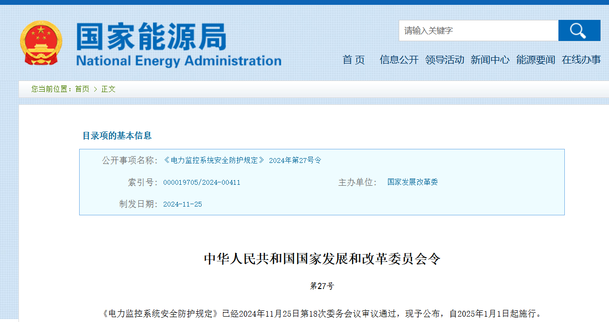? ? ? 近日,國家發(fā)展改革委頒布了新修訂的《電力監(jiān)控系統(tǒng)安全防護規(guī)定》(國家發(fā)展改革委2024年第27號令,以下簡稱27號令),自2025年1月1日起施行,原《電力監(jiān)控系統(tǒng)安全防護規(guī)定》(國家發(fā)展改革委2014年第14號令,以下簡稱27號令)同時廢止。