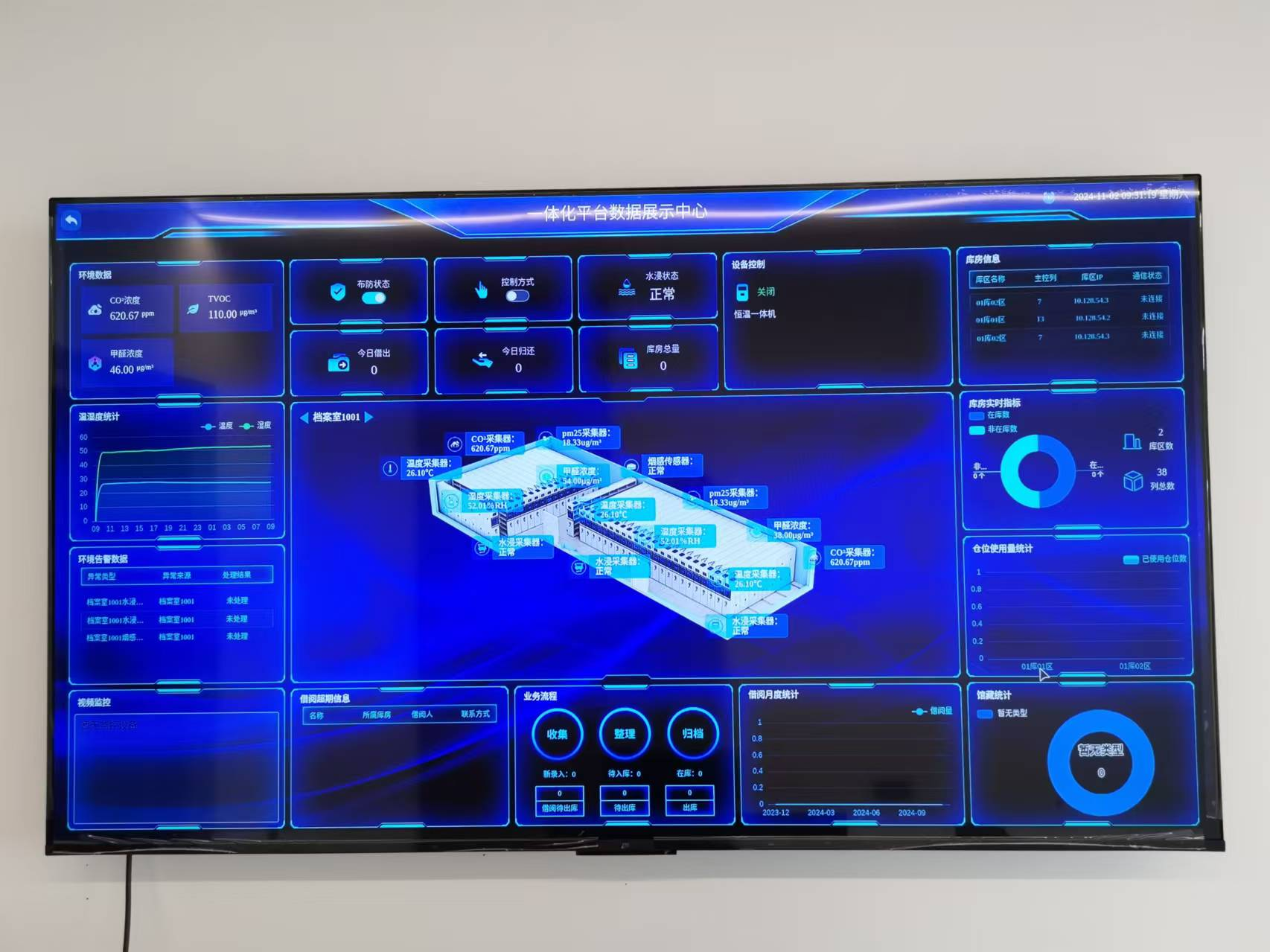 通過液晶顯示大屏來展示環(huán)境數據信息、檔案位置的引導信息、設備報警信息等。